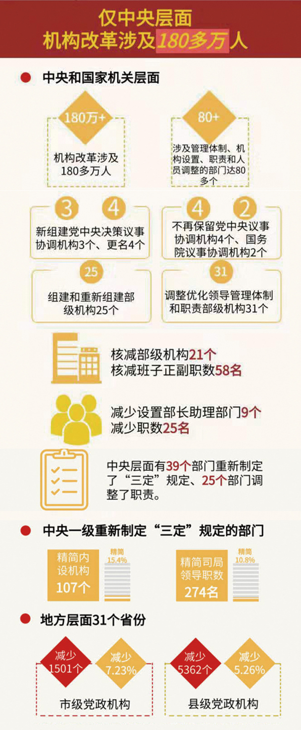 一年多來,在以習近平同志為核心的黨中央堅強領(lǐng)導(dǎo)下,從中央到地方,上下同心,整體性推進各級各類機構(gòu)改革,取得重大成效。 圖表來源:新華社