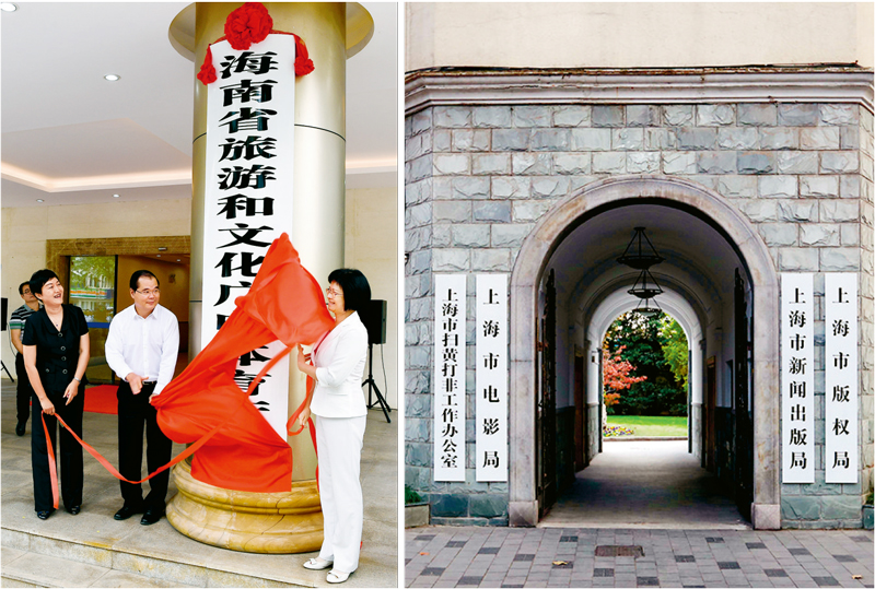 緊張籌備,務(wù)實高效,新一輪機構(gòu)改革蹄疾步穩(wěn)向縱深推進。2018年9月13日,《海南省機構(gòu)改革方案》印發(fā),成為首個獲得中央批準的省級機構(gòu)改革方案;2018年11月11日,上海市委、市政府召開機構(gòu)改革動員會,明確機構(gòu)改革任務(wù)書。至此,我國31個省份機構(gòu)改革方案全部“出爐”并對外公布。 左圖為海南省旅游和文化廣電體育廳掛牌成立(新華社記者 楊冠宇/攝)。右圖為新掛牌的上海市新聞出版局、版權(quán)局、電影局(《解放日報》記者 蔣迪雯/攝)。