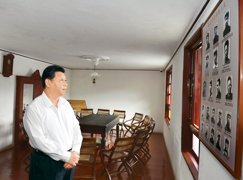 2015年6月16日至18日,中共中央總書記、國家主席、中央軍委主席習(xí)近平在貴州調(diào)研。這是16日下午,習(xí)近平在參觀遵義會(huì)議會(huì)議室時(shí),向墻上的遵義會(huì)議參加人員照片深情凝視。 新華社記者 李學(xué)仁/攝