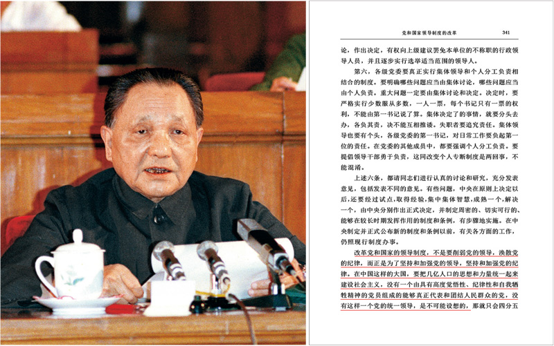 鄧小平同志高度重視堅持和加強黨的領導,旗幟鮮明地指出中國共產黨是社會主義現代化事業(yè)的領導核心,在改革開放和現代化建設中,必須始終堅持黨的領導,加強和改進黨的建設。左圖為鄧小平同志在中國共產黨第十二次全國代表大會上致開幕詞(新華社記者 錢嗣杰/攝);右圖為鄧小平同志有關堅持和加強黨的領導的重要論述。