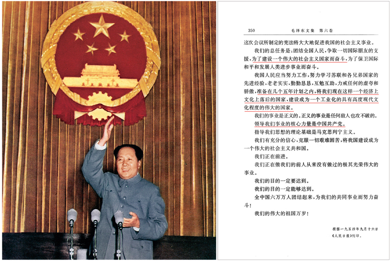 毛澤東同志在1954年第一屆全國人民代表大會第一次全體會議致開幕詞時宣布:準備在幾個五年計劃之內,將我國“建設成為一個工業(yè)化的具有高度現代文化程度的偉大的國家”,強調“領導我們事業(yè)的核心力量是中國共產黨”。左圖為毛澤東同志在第一屆全國人大第一次會議上致開幕詞;右圖為毛澤東同志在開幕詞中的重要論述。