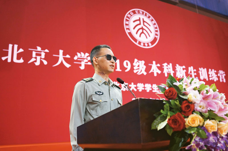 2019年9月3日,“排雷英雄戰(zhàn)士”杜富國為北京大學(xué)3700余名新生作先進(jìn)事跡報(bào)告,為同學(xué)們呈現(xiàn)了一堂感人至深的思政課。杜富國“讓我來”的英雄氣概和革命精神,給剛剛踏入北大校門的新同學(xué)刻下了深深的心靈烙印。圖為杜富國在作報(bào)告。 新華社記者 張永進(jìn)/攝