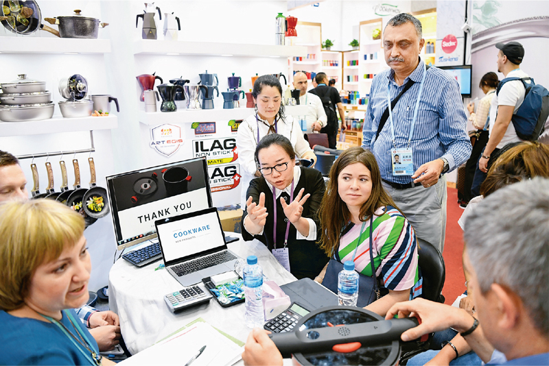 2019年4月15日至5月5日,第125屆中國進(jìn)出口商品交易會(廣交會)在廣州舉辦,累計(jì)出口成交1995.24億元人民幣。本屆廣交會對“一帶一路”沿線國家和地區(qū)出口成交額同比增長9.9%,我國民營企業(yè)成為最大參展主體。圖為4月23日,參展商向外國采購商介紹廚房產(chǎn)品。 新華社記者 鄧華/攝