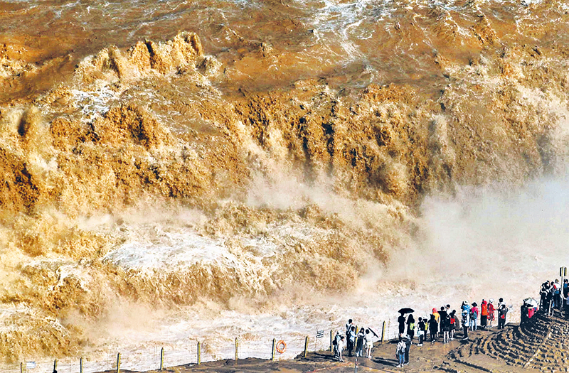 壺口瀑布是黃河流經(jīng)秦晉大峽谷時形成的一個天然瀑布,其奔騰不息、磅礴洶涌的氣勢被視為中華民族自強不息、百折不撓、勇往直前精神的象征?!帮L在吼,馬在叫,黃河在咆哮……保衛(wèi)家鄉(xiāng)!保衛(wèi)黃河!保衛(wèi)華北!保衛(wèi)全中國!”1939年,正是這里的壯觀景象激發(fā)了創(chuàng)作者的靈感,寫出膾炙人口的《黃河大合唱》。圖為游客在位于山西省吉縣的黃河壺口瀑布游覽(攝于2019年6月30日)。 視覺中國 呂桂明/攝