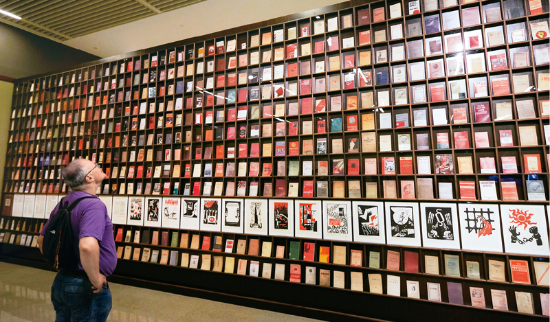 2018年5月9日,一位外國(guó)觀(guān)眾被北京“真理的力量——紀(jì)念馬克思誕辰200周年主題展覽”中一面展示不同國(guó)家出版的500多種《共產(chǎn)黨宣言》的書(shū)墻所吸引。 中新社記者 賈天勇/攝