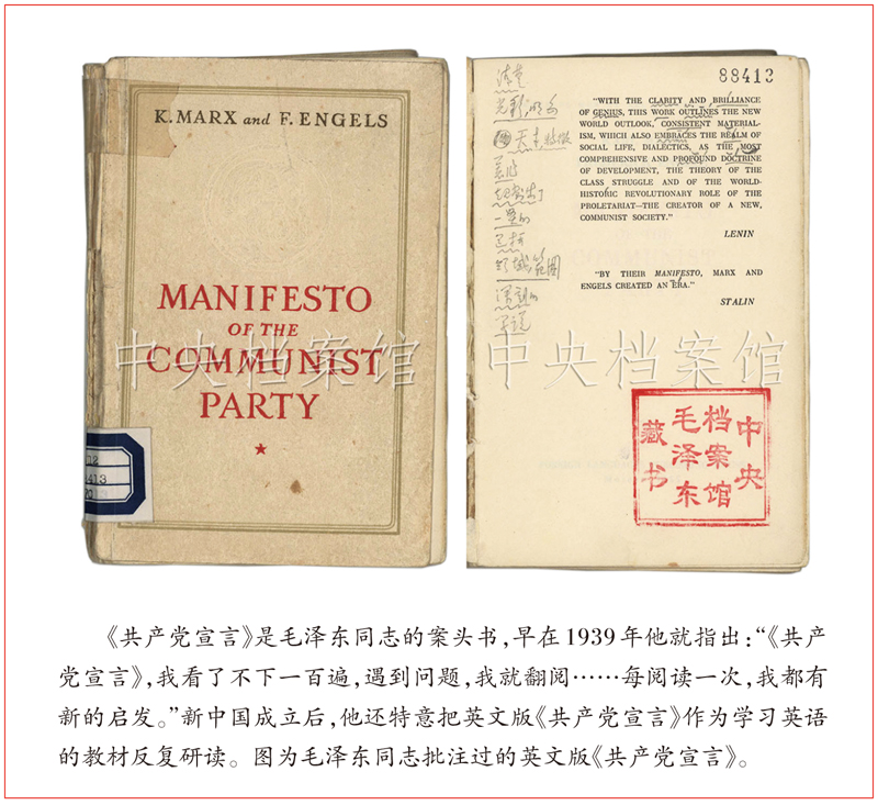 1919年底,青年毛澤東第二次來到北京,住了100多天。在此期間,有三本書特別地銘刻在他的心中,建立起他對(duì)馬克思主義的信仰,第一本就是《共產(chǎn)黨宣言》。后來在延安同美國記者埃德加·斯諾暢談時(shí),他這樣回憶說:“我一旦接受了馬克思主義是對(duì)歷史的正確解釋以后,我對(duì)馬克思主義的信仰就沒有動(dòng)搖過。” 朱德同志從青年時(shí)期就開始讀《共產(chǎn)黨宣言》,1976年5月,90歲高齡的他,收到《共產(chǎn)黨宣言》新譯本后,即刻用一整天時(shí)間,對(duì)照新舊譯文認(rèn)真學(xué)習(xí)。一個(gè)多月后,朱德同志因病去世了。他活到老、學(xué)到老,始終把《共產(chǎn)黨宣言》作為堅(jiān)定馬克思主義信仰、共產(chǎn)主義信念的精神支柱。