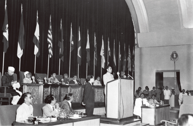 1955年4月,周恩來率中國(guó)代表團(tuán)出席在印度尼西亞萬隆召開的亞非會(huì)議。會(huì)議在和平共處五項(xiàng)原則基礎(chǔ)上,提出處理國(guó)家間關(guān)系的十項(xiàng)原則,為推動(dòng)國(guó)際關(guān)系朝著正確方向發(fā)展,為推動(dòng)亞非合作、南南合作,為促進(jìn)南北合作,發(fā)揮了重大歷史性作用。這是新中國(guó)走上國(guó)際舞臺(tái)進(jìn)程中的重要里程碑。圖為周恩來在萬隆會(huì)議上發(fā)言。 新華社發(fā)