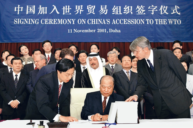 2001年11月,在卡塔爾首都多哈舉行的世界貿(mào)易組織第四屆部長(zhǎng)級(jí)會(huì)議通過中國(guó)加入世界貿(mào)易組織的決定。同年12月,中國(guó)正式加入世界貿(mào)易組織,標(biāo)志著中國(guó)對(duì)外開放進(jìn)入歷史新階段。圖為2001年11月11日,中國(guó)政府代表簽署《中國(guó)加入世界貿(mào)易組織議定書》。 視覺中國(guó)供圖