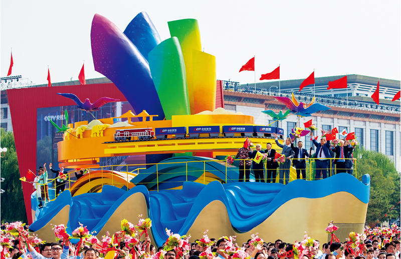 2019年10月1日上午,慶祝中華人民共和國(guó)成立70周年大會(huì)在北京天安門廣場(chǎng)隆重舉行。圖為群眾游行中的“人類命運(yùn)共同體”方陣。彩車上,“一帶一路”通古今,“友誼之橋”跨海陸,和平風(fēng)帆共五洲。中國(guó)發(fā)展離不開世界,世界發(fā)展也需要中國(guó)。 視覺中國(guó)供圖
