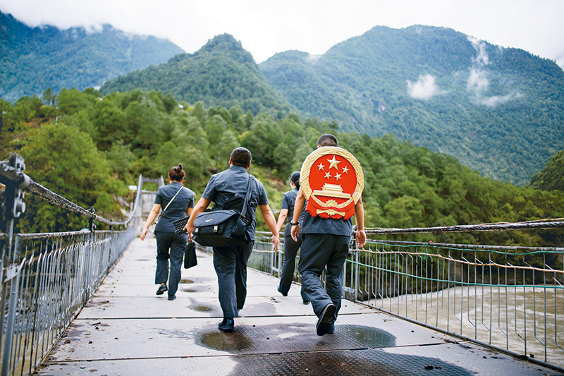 云南省怒江傈僳族自治州98%以上的面積是高山峽谷,交通不便,法官們經(jīng)常背著國徽攀高山、過索橋、躲落石、鉆老林,為群眾進行法律服務。圖為貢山縣人民法院法官鄧興背著國徽與同事們跨過怒江(2019年8月30日攝)。 新華社記者 江文耀/攝