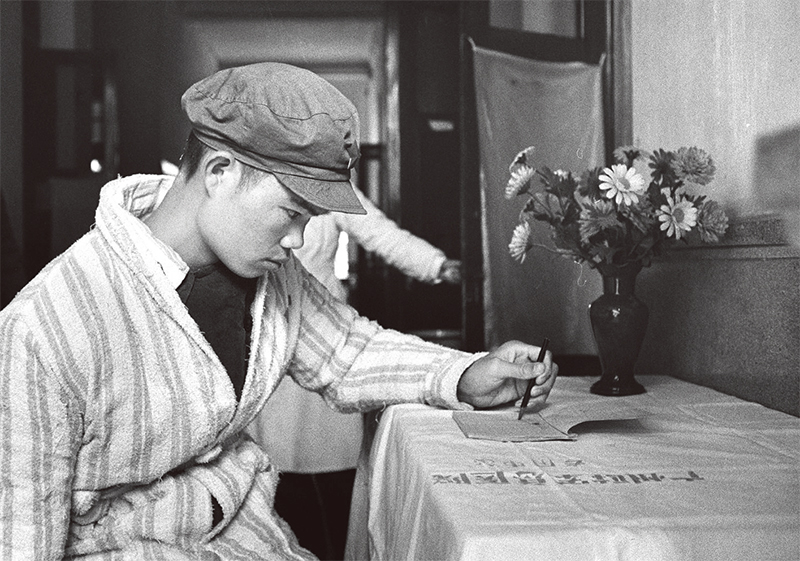 麥賢得在“八六”海戰(zhàn)中頭部負重傷,他以超人的毅力和頑強的意志,堅持戰(zhàn)斗,直到取得勝利。經過醫(yī)務人員的精心治療和護理,他的身體逐漸恢復。圖為1966年麥賢得傷愈后,右手活動還不方便,他以百折不撓的精神,練習用左手寫字。 新華社 鄒健東/攝