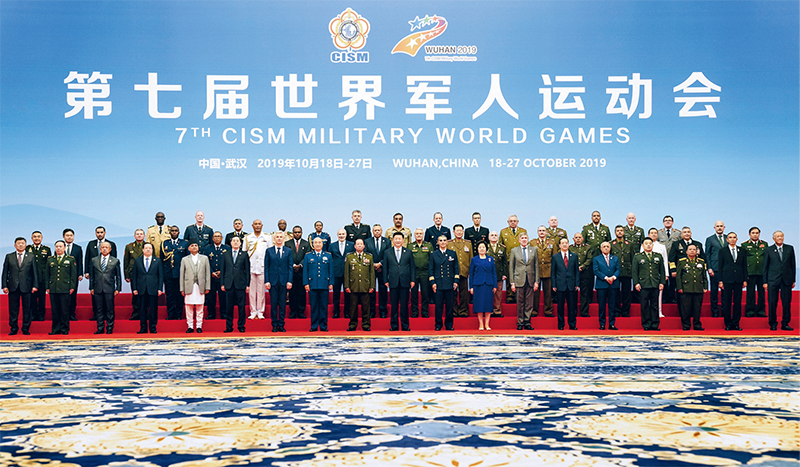 2019年10月18日下午,中共中央總書記、國(guó)家主席、中央軍委主席習(xí)近平在武漢集體會(huì)見應(yīng)邀出席第七屆世界軍人運(yùn)動(dòng)會(huì)開幕式的各國(guó)防務(wù)部門和軍隊(duì)領(lǐng)導(dǎo)人及國(guó)際軍事體育理事會(huì)主要官員,代表中國(guó)政府、中國(guó)人民和中國(guó)軍隊(duì)向出席活動(dòng)的各國(guó)防務(wù)部門和軍隊(duì)領(lǐng)導(dǎo)人、國(guó)際軍事體育理事會(huì)官員、各國(guó)運(yùn)動(dòng)員表示熱烈歡迎。圖為會(huì)見前,習(xí)近平同出席第七屆世界軍人運(yùn)動(dòng)會(huì)開幕式的各國(guó)防務(wù)部門和軍隊(duì)領(lǐng)導(dǎo)人及國(guó)際軍事體育理事會(huì)主要官員合影。 新華社記者 李剛/攝