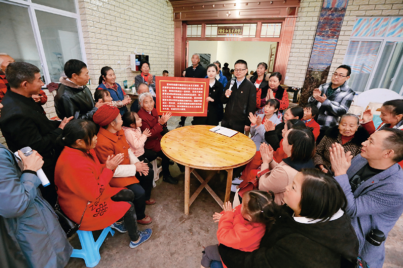 黨的十九屆四中全會召開后,四川省洪雅縣結(jié)合開展第二批“不忘初心、牢記使命”主題教育,在組織黨員干部學習的同時,組成宣講小分隊向基層干部群眾深入宣講黨的十九屆四中全會精神。圖為2019年11月5日,洪雅縣紀委監(jiān)委干部在余坪鎮(zhèn)黃里村村民家中開展宣講。 人民圖片 姚永亮/攝