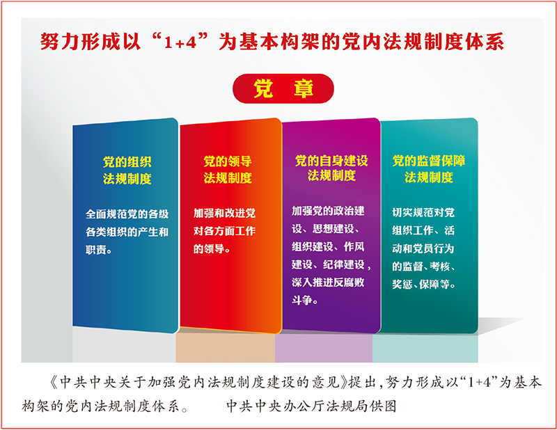 一要統(tǒng)籌推進(jìn)各位階黨內(nèi)法規(guī)制度建設(shè)。黨內(nèi)法規(guī)制度體系是以黨章為根本,以民主集中制為核心,以準(zhǔn)則、條例等中央黨內(nèi)法規(guī)為主干,由各領(lǐng)域各層級(jí)黨內(nèi)法規(guī)制度組成的有機(jī)統(tǒng)一整體。要以黨的根本大法為“綱”統(tǒng)領(lǐng)黨內(nèi)法規(guī)制度體系建設(shè),始終尊崇黨章、貫徹黨章、維護(hù)黨章,牢固樹立黨章是一切黨內(nèi)法規(guī)源頭的鮮明導(dǎo)向,以對(duì)黨章規(guī)定的細(xì)化和落實(shí)定位黨內(nèi)法規(guī),以黨章為根本依據(jù)制定黨內(nèi)法規(guī),以黨章統(tǒng)率形成完善的黨內(nèi)法規(guī)制度體系。要將制定準(zhǔn)則、條例作為構(gòu)建黨內(nèi)法規(guī)制度體系的主體工程,落實(shí)新時(shí)代黨的建設(shè)總要求,有針對(duì)性地制定修訂有關(guān)準(zhǔn)則和條例,夯實(shí)和鞏固黨內(nèi)法規(guī)制度體系的“四梁八柱”,進(jìn)一步完善對(duì)全黨政治生活、組織生活和全體黨員行為等的基本規(guī)定,實(shí)現(xiàn)對(duì)黨的領(lǐng)導(dǎo)和黨的建設(shè)各方面重要關(guān)系、重要工作的全覆蓋。要有針對(duì)性地制定和完善相應(yīng)配套法規(guī),及時(shí)為黨內(nèi)法規(guī)制度體系“添磚加瓦”,形成以準(zhǔn)則、條例為龍頭,以配套性的規(guī)定、辦法、規(guī)則、細(xì)則為細(xì)化補(bǔ)充的制度群,為黨的各方面具體工作提供規(guī)范和保障,增強(qiáng)黨內(nèi)法規(guī)制度的針對(duì)性和可操作性。
