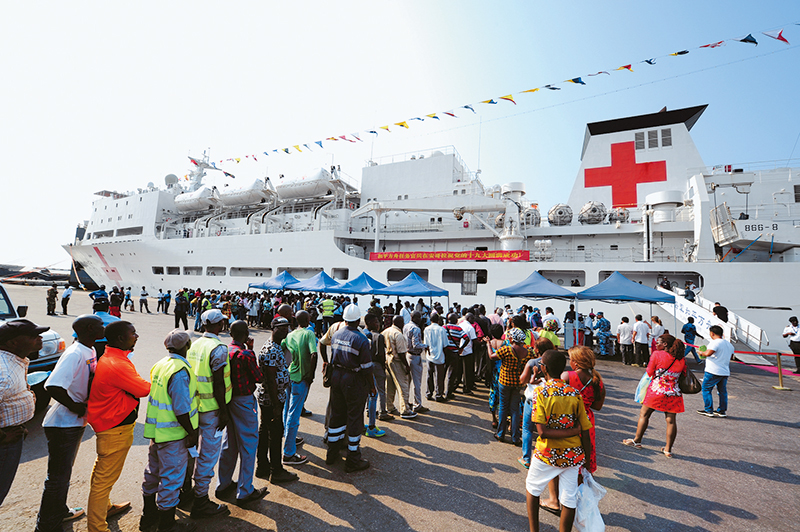 2017年10月,中國海軍“和平方舟”號醫(yī)院船抵達安哥拉羅安達碼頭,消息傳開后數(shù)以千計當?shù)孛癖娪可洗a頭前來尋診。 江山/攝