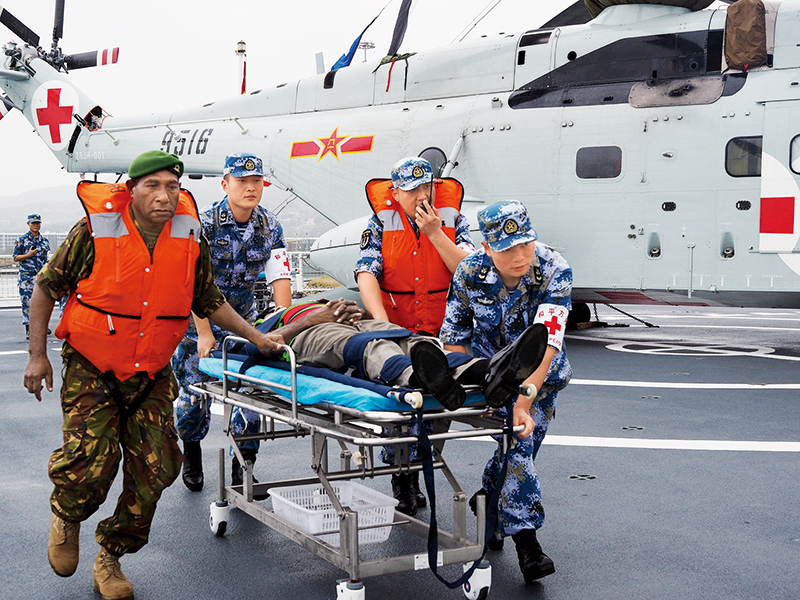 2018年7月17日,正在執(zhí)行“和諧使命—2018”任務的中國海軍“和平方舟”號醫(yī)院船官兵,與巴布亞新幾內(nèi)亞軍地醫(yī)務工作者在巴布亞新幾內(nèi)亞莫爾斯比港成功舉行了一場聯(lián)合應急醫(yī)學救援演練。 江山/攝