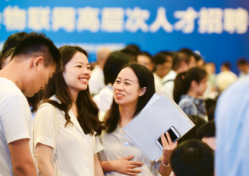 2019年我國(guó)城鎮(zhèn)新增就業(yè)1352萬(wàn)人,連續(xù)7年保持在1300萬(wàn)人以上,明顯高于1100萬(wàn)人以上的預(yù)期目標(biāo)。圖為2019年9月8日,2019世界物聯(lián)網(wǎng)博覽會(huì)物聯(lián)網(wǎng)高層次人才招聘會(huì)在無(wú)錫舉辦,80家物聯(lián)網(wǎng)及相關(guān)行業(yè)的重點(diǎn)企業(yè)集中攬才,提供稅后年薪不低于12萬(wàn)元的高端崗位1283個(gè)。 人民圖片 還月亮/攝