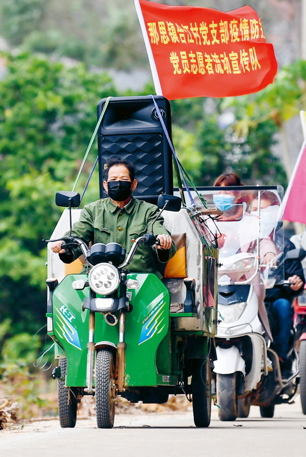 連日來,廣西欽州市構(gòu)建縣、鄉(xiāng)、村三級聯(lián)防聯(lián)控機制,近萬名黨員干部和志愿者奔赴一線,投入到新冠肺炎疫情防控工作中。圖為2月1日欽州市欽南區(qū)那思鎮(zhèn)合江村黨員吳光圍(前)帶領宣傳隊進村宣傳防疫知識。 新華社記者 張愛林/攝