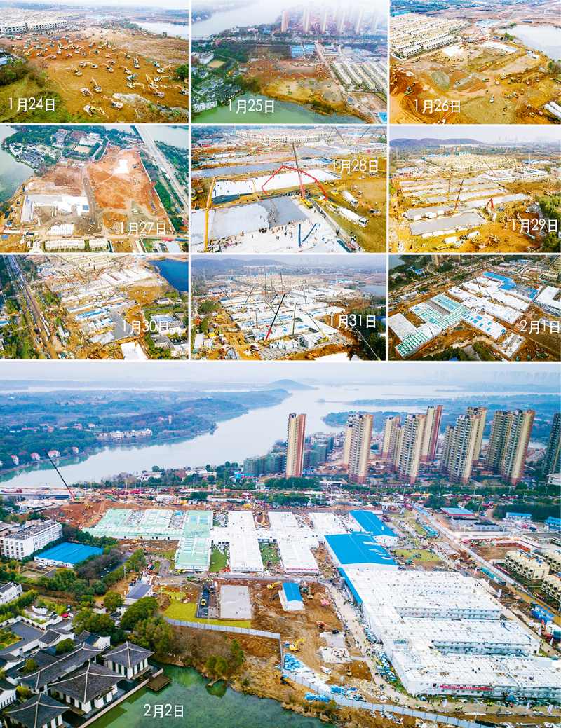 總建筑面積超過3萬平方米,架設箱式板房近2000間,接診區(qū)病房樓ICU俱全……火神山醫(yī)院從開始設計到建成完工,歷時10天。圖為標注日期的拼版照片(無人機拍攝)。 新華社記者 肖藝九/攝