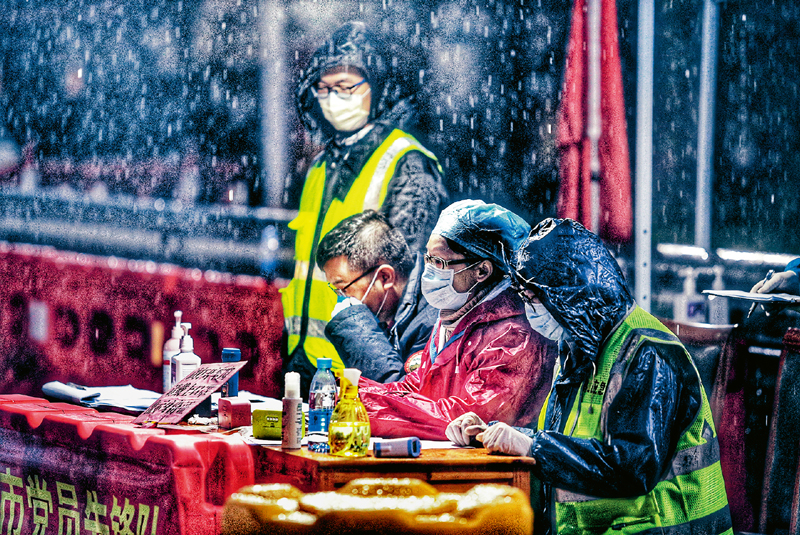 連日來,廣東省鶴山市廣大黨員、機關干部、民警,主動放棄休假,24小時輪值堅守崗位,全力打好疫情防控戰(zhàn),切實維護人民生命安全和身體健康。圖為2月4日凌晨,鶴山市大雨傾盆,天氣寒冷,黨員干部、醫(yī)務人員在公安民警、交通執(zhí)法等單位人員配合下,對進入鶴山市的所有車輛人員進行體溫檢測、詢問情況。 人民圖片 黃繼明/攝