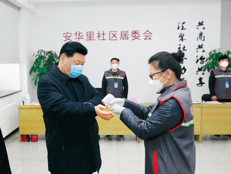 2020年2月10日,中共中央總書記、國(guó)家主席、中央軍委主席習(xí)近平在北京調(diào)研指導(dǎo)新冠肺炎疫情防控工作。這是習(xí)近平來(lái)到朝陽(yáng)區(qū)安貞街道安華里社區(qū),了解基層一線疫情聯(lián)防聯(lián)控情況。 新華社記者 鞠鵬/攝