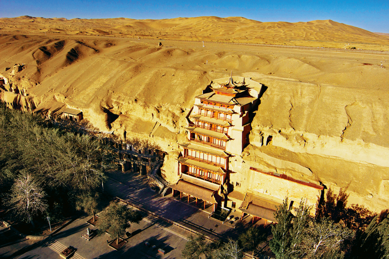 敦煌是河西諸綠洲中為戈壁環(huán)繞的最小綠洲,適宜的自然和文化生態(tài)環(huán)境,不僅使這里成為一千余年各朝開窟不輟、歷代造像迭新的特殊佛教圣地,更以遺存的大量中古文書與其他各類文物成為著名的人類文化遺產(chǎn)。圖為敦煌莫高窟九層樓全景。 敦煌研究院供圖 吳健/攝