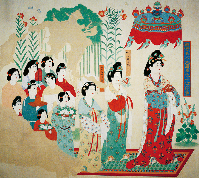 敦煌佛教洞窟的興建,歷代世家大族、甚至皇室貴族是主要推動者。壁畫反映了當時人們的現(xiàn)實生活和人生百態(tài)。圖為段文杰臨摹的莫高窟第130窟甬道南壁盛唐時期都督夫人供養(yǎng)像壁畫。 敦煌研究院供圖 吳健/攝