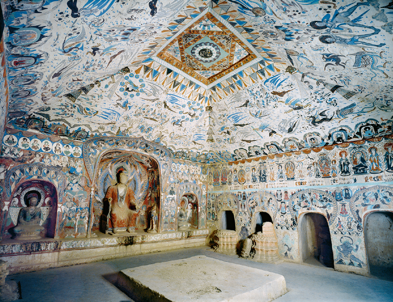 莫高窟第285窟有西魏大統(tǒng)四年(538年)、五年(539年)的題記,是莫高窟最早有明確紀年的洞窟。這一洞窟帶有明顯的中原風(fēng)格特征,窟頂都有飛動的彩云和各種傳說中的神怪,其中還有中國的神仙,反映了外來佛教與中國本土文化的融合。圖為莫高窟第285窟的洞窟形制。 敦煌研究院供圖