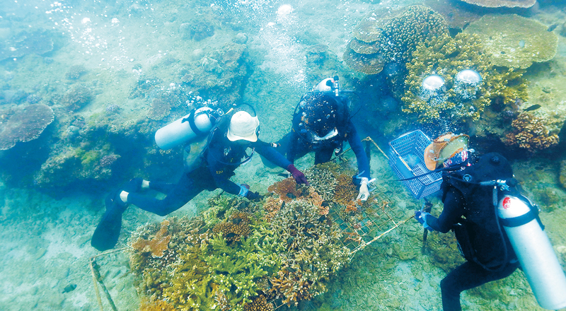珊瑚礁生態(tài)系統(tǒng)也被稱為水下“熱帶雨林”, 具有保護海岸、維護生物多樣性、維持漁業(yè)資源、吸引旅游觀光等重要功能。圖為“海底護林員”正用手清理隨著海流漂來的各種海底垃圾,以防垃圾長期沉淀,影響珊瑚生長。 海南省委宣傳部供圖 張杰/攝
