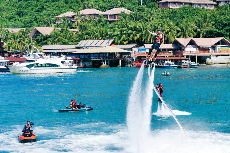 近年來,海南加強海岸帶綜合保護和開發(fā),“點、線、面”全面推進全域旅游建設(shè),形成“山?;樱{綠互補”旅游圈。圖為2019年10月4日,游客在分界洲島旅游區(qū)體驗水上游樂項目。 新華社記者 楊冠宇/攝