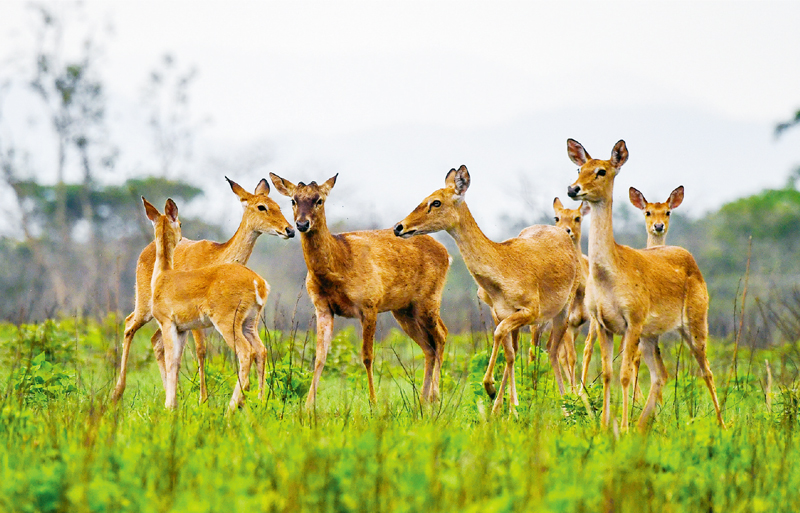 海南坡鹿是特產(chǎn)于海南島的熱帶珍稀鹿種,屬于國家一級保護動物。近年來,海南以坡鹿生境改造、人工馴化繁育等多種方式來對坡鹿進行保護,海南坡鹿由20世紀的瀕臨滅絕,到現(xiàn)在數(shù)量逐漸增多、種群逐漸穩(wěn)定,成為海南綠色生態(tài)的一張名片。圖為海南大田國家級自然保護區(qū)內(nèi)的坡鹿群落。 新華社記者 楊冠宇/攝