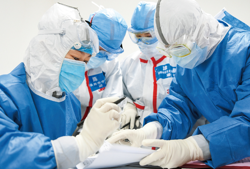 2020年2月14日,武漢市首個(gè)以中醫(yī)為主的方艙醫(yī)院開(kāi)始收治病人。這是醫(yī)護(hù)人員在核對(duì)病人的床位安置信息。在新冠肺炎疫情防控和醫(yī)療救治中,我國(guó)發(fā)揮中醫(yī)藥優(yōu)勢(shì),堅(jiān)持中西醫(yī)結(jié)合、中西醫(yī)并重,取得了較好成效。 新華社記者 程敏/攝