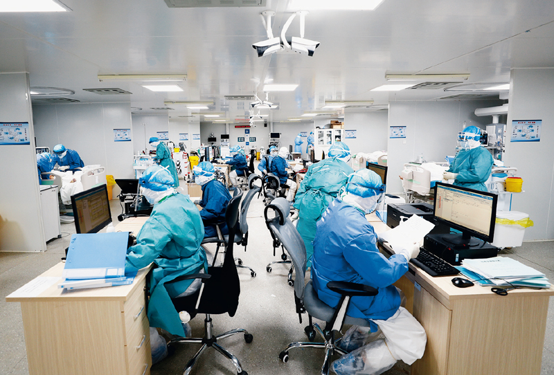 2020年2月24日,火神山醫(yī)院重癥醫(yī)學(xué)一科工作場景。 人民圖片 王皓宇/攝