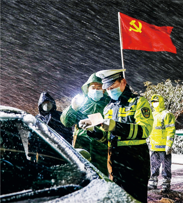 新冠肺炎疫情發(fā)生后,安徽省合肥市廬江縣公安、交通、醫(yī)療衛(wèi)生等部門聯(lián)手作戰(zhàn),嚴(yán)把車輛人員入口關(guān)。圖為2020年2月15日夜,公安民警冒著嚴(yán)寒在風(fēng)雪黑夜里堅(jiān)守疫情防控崗位,甘做人民群眾的安全“守夜人”。 中新社 左學(xué)長/攝