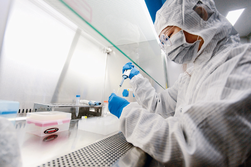 當(dāng)前,疫情防控正處在最吃勁的關(guān)鍵階段,容不得一絲懈怠。疫情防控不獲全勝,醫(yī)療物資保障就決不輕言成功。圖為2020年2月17日,在江蘇省揚州市邗江生物醫(yī)藥創(chuàng)新實驗中心,工作人員在生物安全柜操作臺上對新冠肺炎病毒檢測試劑進行操作。 人民圖片 孟德龍/攝