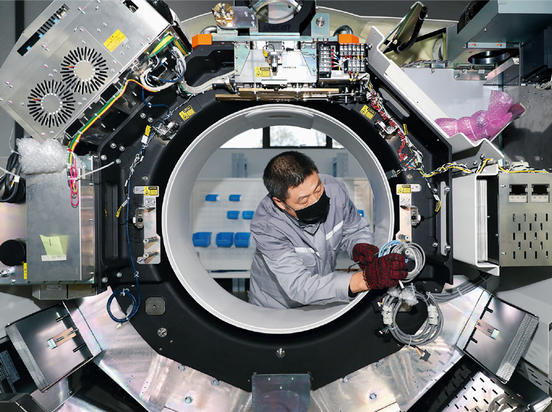 按照黨中央統(tǒng)一領(lǐng)導(dǎo)、統(tǒng)一指揮、統(tǒng)一行動的要求,許多企業(yè)全力以赴確保醫(yī)療物資生產(chǎn)供應(yīng),為打贏疫情防控阻擊戰(zhàn)提供有力支撐。圖為2020年2月11日,位于浙江省寧波市梅山保稅港區(qū)的康達(dá)洲際醫(yī)療器械有限公司的員工正在抓緊組裝CT機。 人民圖片 陳張坤/攝