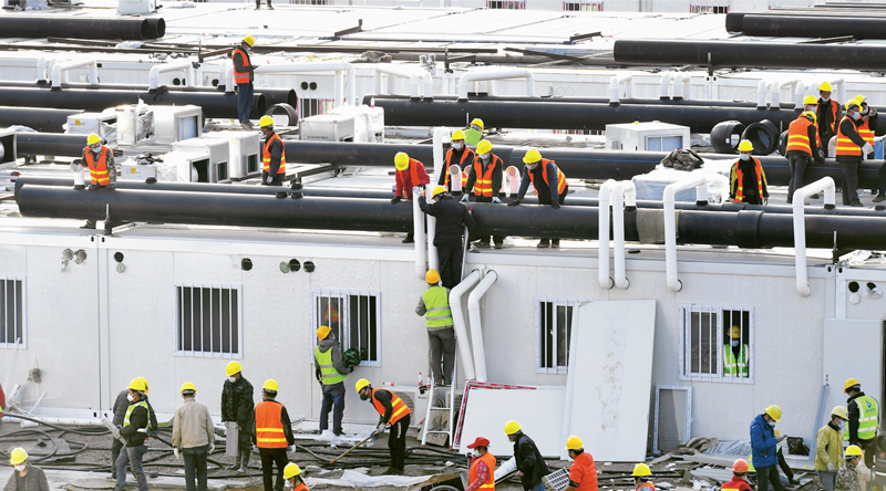 奮斗在黨和人民最需要的地方,是國(guó)有企業(yè)的光榮傳統(tǒng),是國(guó)企人的血脈靈魂。建設(shè)武漢火神山、雷神山專門醫(yī)院是黨和人民的重托,國(guó)有企業(yè)主動(dòng)請(qǐng)纓、盡銳出戰(zhàn),打一場(chǎng)過(guò)硬的攻堅(jiān)戰(zhàn)。中國(guó)建筑所屬中建三局承建雷神山醫(yī)院,經(jīng)過(guò)10晝夜的奮戰(zhàn),醫(yī)院通過(guò)驗(yàn)收,并于2020年2月6日正式移交使用。圖為2月5日,武漢雷神山醫(yī)院施工現(xiàn)場(chǎng)。 中新社記者 安源/攝