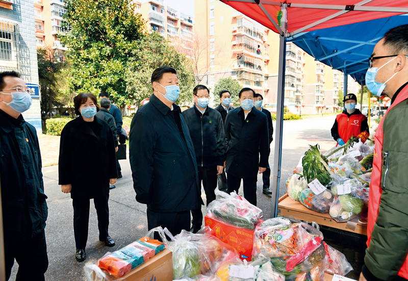 2020年3月10日,中共中央總書(shū)記、國(guó)家主席、中央軍委主席習(xí)近平專(zhuān)門(mén)赴湖北省武漢市考察新冠肺炎疫情防控工作。這是習(xí)近平在東湖新城社區(qū)生活物資集中配送點(diǎn),詳細(xì)詢(xún)問(wèn)社區(qū)群眾生活物資采購(gòu)和供應(yīng)情況。 新華社記者 謝環(huán)馳/攝