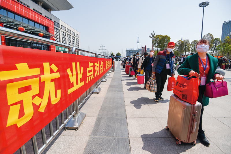 農(nóng)民工是我國產(chǎn)業(yè)工人的主體。要建立健全農(nóng)民工返崗務工溝通協(xié)調機制,加強輸出地和輸入地信息對接、運輸對接、健康檢測對接,暢通“點對點、一站式”復工服務通道,推動疫情防控期間務工人員安全有序返崗。圖為2020年3月19日,湖北省首批務工人員返崗就業(yè)專列從荊州火車站出發(fā),外出務工人員正在進站乘車。 人民圖片 黃志剛/攝