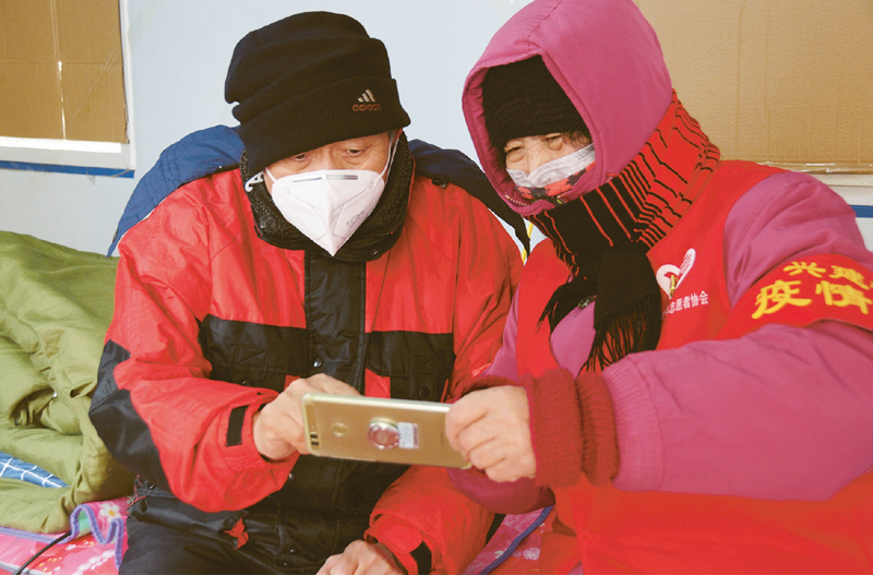 今年70歲的于慶河和69歲的黃玉芹是住在黑龍江哈爾濱平房區(qū)興建街道上海新村社區(qū)的一對夫妻,兩人都是有多年黨齡的老黨員。面對疫情,夫妻二人“人老心不老”,第一時間報名加入志愿者團(tuán)隊(duì),積極參加社區(qū)疫情防控值勤工作。圖為2020年3月3日,于慶河(左)、黃玉芹在閑暇時通過手機(jī)與兒子、兒媳互報平安。 新華社記者 強(qiáng)勇/攝