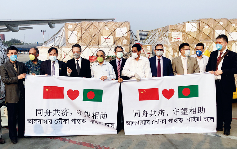 2020年3月26日,中國向孟加拉國提供緊急抗疫醫(yī)療物資援助。圖為中國駐孟加拉國大使李極明(左四)在孟加拉國首都達卡向孟方轉(zhuǎn)交援助物資。 新華社記者 劉春濤/攝