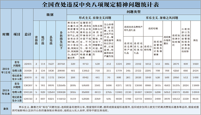 2020年1月19日,中央紀(jì)委國家監(jiān)委公布了2019年12月全國查處違反中央八項(xiàng)規(guī)定精神問題統(tǒng)計(jì)表,首次向社會(huì)公開發(fā)布查處形式主義、官僚主義問題的數(shù)據(jù),并對查處享樂主義、奢靡之風(fēng)問題的數(shù)據(jù)統(tǒng)計(jì)指標(biāo)進(jìn)行了優(yōu)化調(diào)整。圖為全國查處違反中央八項(xiàng)規(guī)定精神問題統(tǒng)計(jì)表。 數(shù)據(jù)來源:中央紀(jì)委國家監(jiān)委黨風(fēng)政風(fēng)監(jiān)督室 許仲冠/制圖