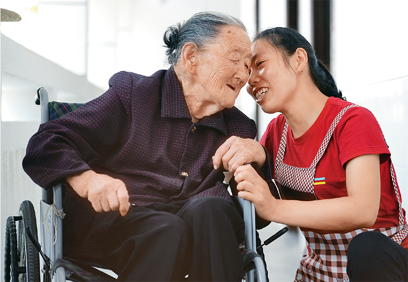 陜西省寧陜縣自2016年開始實行貧困失能、半失能人員集中供養(yǎng),為其提供干凈舒適的住所、24小時全面護理,不僅讓貧困失能、半失能人員得到良好照料,也徹底將失能家庭解放出來,全身心脫貧致富奔小康。圖為2018年8月20日,寧陜縣中心敬老院五保失能托養(yǎng)中心內(nèi),護理員在與托養(yǎng)老人聊天。 新華社記者 劉瀟/攝