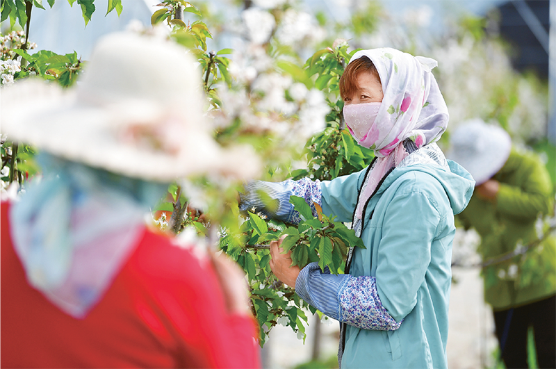 甘肅省天水市秦州區(qū)多個鄉(xiāng)鎮(zhèn)的農業(yè)企業(yè)、扶貧車間和農民專業(yè)合作社近期陸續(xù)復工復產,采取靈活多樣的形式幫助農民實現“家門口”就業(yè)增收。圖為2020年3月13日,秦州區(qū)楊家寺鎮(zhèn)鄭宋村農民在櫻桃種植大棚內進行田間管理。 新華社記者 陳斌/攝