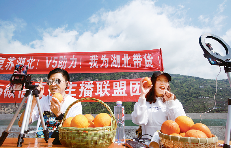 疫情倒逼我國消費數(shù)字化轉(zhuǎn)型和產(chǎn)業(yè)數(shù)字化升級,以互聯(lián)網(wǎng)經(jīng)濟為代表的新動能顯現(xiàn)出強勁生命力。圖為2020年4月19日,湖北宜昌茗橙茶香電商企業(yè)采用5G直播技術(shù),介紹秭歸倫晚臍橙的品質(zhì)和其獨特的峽江生長環(huán)境,現(xiàn)場銷售10萬余斤。 人民圖片 王罡/攝