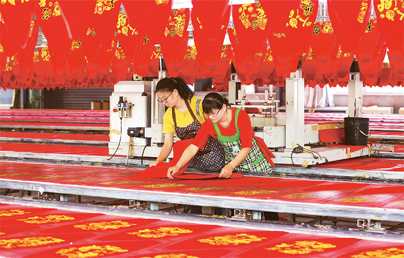為降低疫情影響,我國就業(yè)優(yōu)先政策不斷發(fā)力,促進了就業(yè)穩(wěn)定。圖為2020年4月22日,安徽省五河縣郜臺村豪彩工藝品加工有限公司大紅燈籠扶貧車間里,工人們正緊張有序生產(chǎn)。 人民圖片 李向前/攝