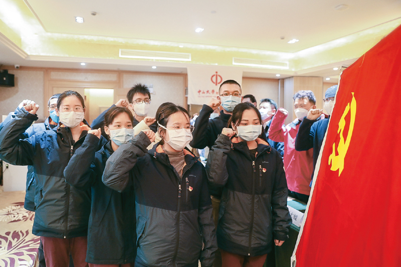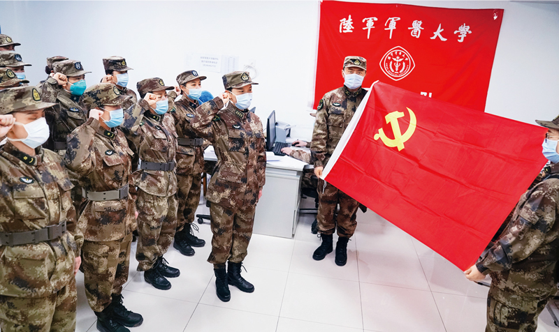 3月5日下午,在中日友好醫(yī)院援鄂醫(yī)療隊住地。鮮艷的黨旗前,18名醫(yī)療隊員舉起右手,鄭重宣誓:“我志愿加入中國共產(chǎn)黨……”