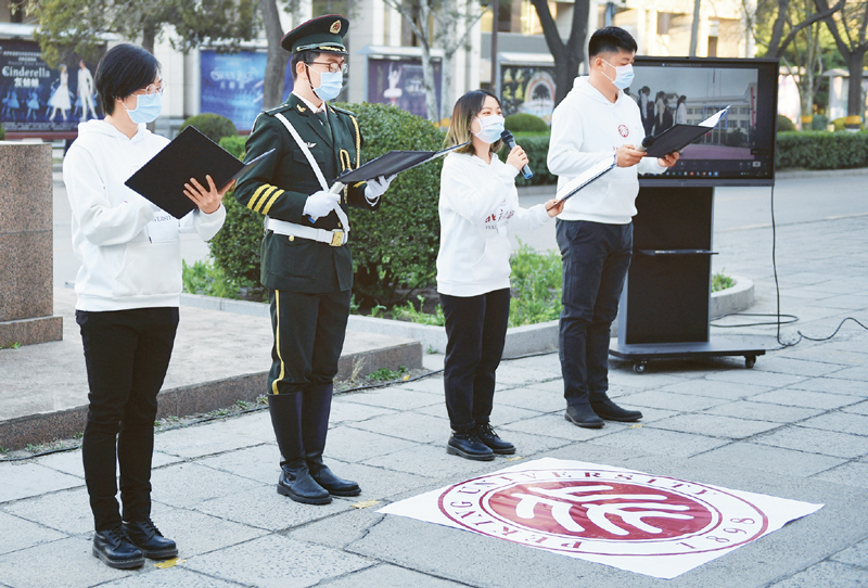 2020年3月23日,北京大學(xué)的師生在“讓青春在黨和人民最需要的地方綻放絢麗之花”為主題的升旗儀式上進(jìn)行詩朗誦。 新華社記者 張晨霖/攝