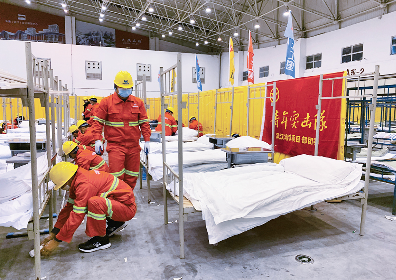 2020年2月6日,共青團(tuán)組織武漢地鐵青年突擊隊(duì)搶建武漢客廳“方艙醫(yī)院”。 共青團(tuán)中央供圖 章旭/攝