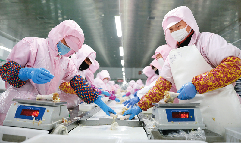 解決好中小微企業(yè)復(fù)工復(fù)產(chǎn)中面臨的融資問(wèn)題,不僅是一個(gè)重要的經(jīng)濟(jì)金融問(wèn)題,更是一個(gè)重要的就業(yè)和民生問(wèn)題。遼寧鞍山銀行等金融機(jī)構(gòu)通過(guò)一系列“春風(fēng)行動(dòng)”,為企業(yè)復(fù)工復(fù)產(chǎn)提供金融支持。圖為2020年3月9日,在鞍山星奧肉禽有限公司生產(chǎn)車(chē)間,工作人員在流水線上分揀雞腿。 新華社記者 姚劍鋒/攝